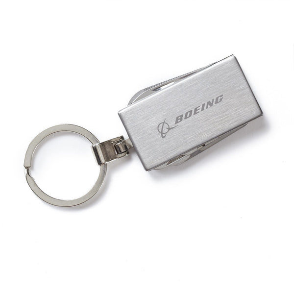Carry your keys and more with this handy stainless-steel key ring that features a nail file, knife, mini-ruler, bottle opener, and scissors. The Boeing logo is laser-engraved on one side. Measures 4.4" x 1.34" x 0.3". Imported.