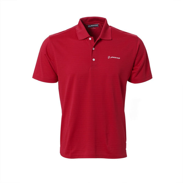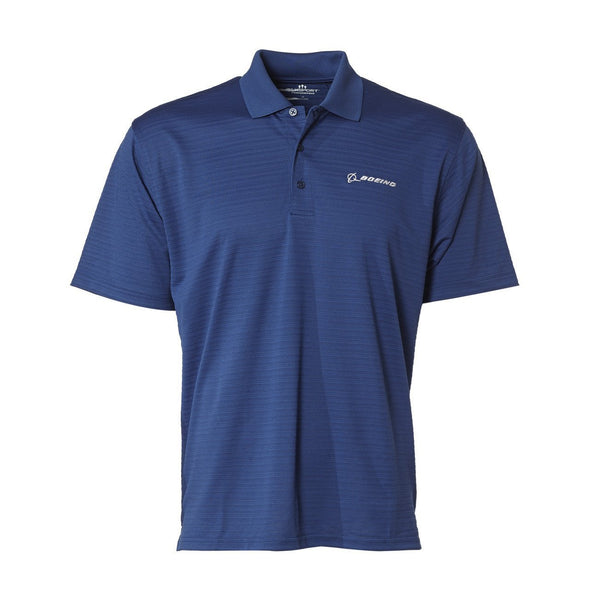 Sporty styling and high performance make this the ideal active polo. Features 100% polyester moisture-wicking fabric styled with textured tone-on-tone striping, solid rib-knit collar, dropped tail bottom, and a tagless label. Boeing logo embroidered on left chest. Imported.