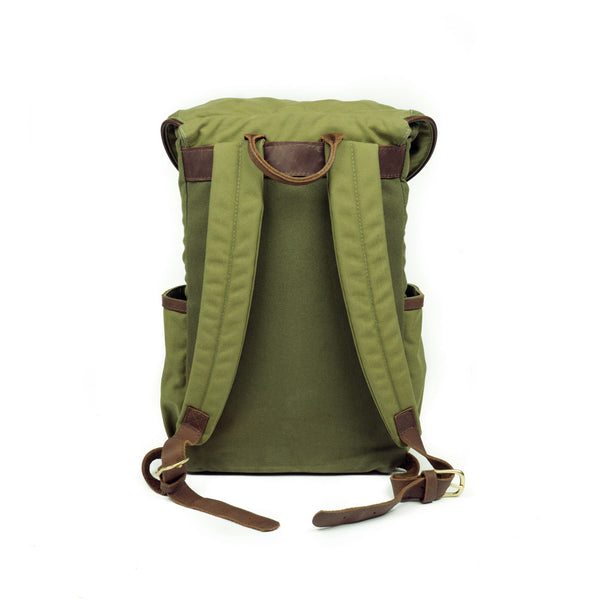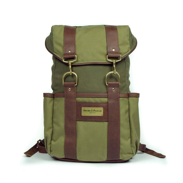Sword & Plough repurposes and recycles military gear for civilian applications to remind the public of the challenges faced by service people and support veteran employment. This signature piece is a durable rucksack handcrafted in olive and forest green fabric recycled from laundry bags and sleeping-bag bivouac sacks with full-grain American leather accents. Handsome unisex backpack has padded shoulder straps, a cinch closure to keep gear dry, a waterproof laptop sleeve, two exterior side pockets, Sword & Plough brass tag, and a zippered lid-pouch for easy access to small belongings. Colors may vary slightly. Use of fabric protectant spray is recommended. Measures 18" x 5" x 11". Made in U.S.A.